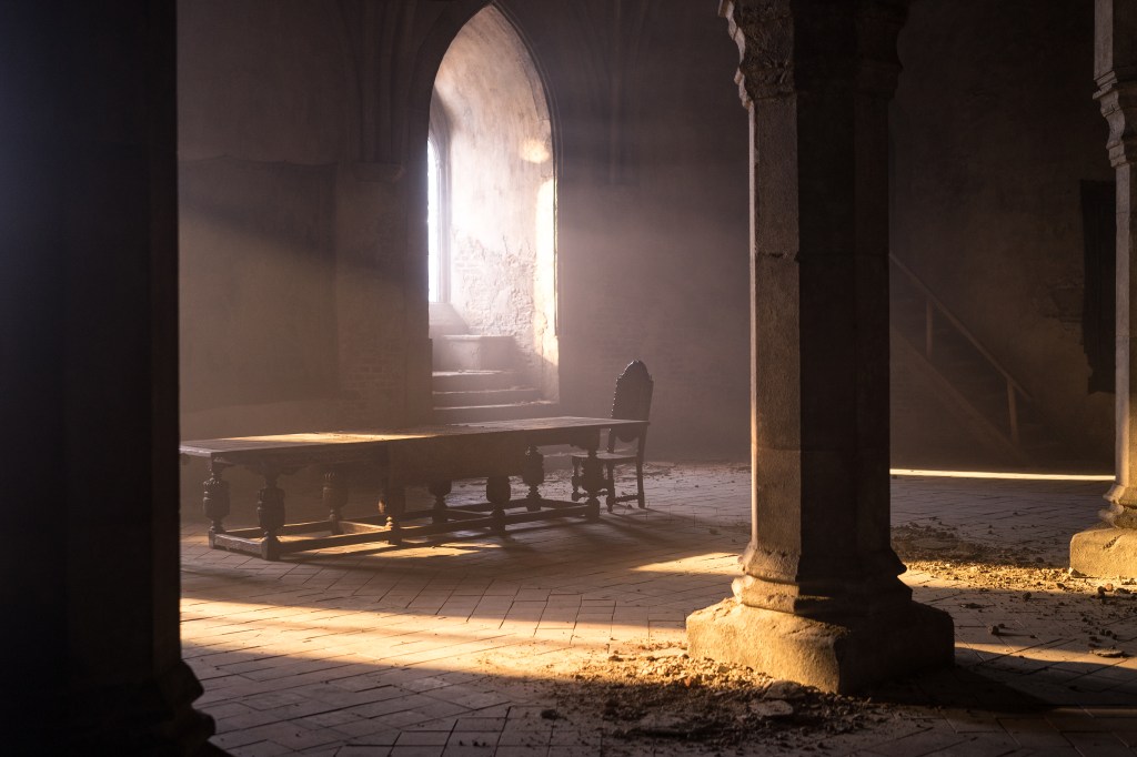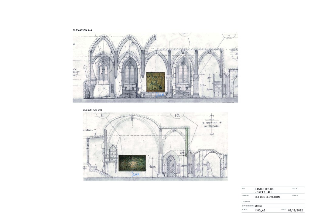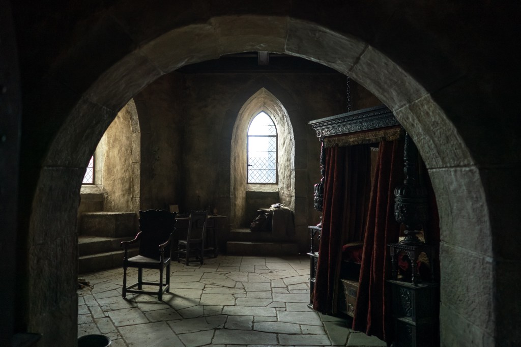 And then the rest of the details, it’s actually almost a lack of some of the stuff. It’s not as much stuff. You’ve noticed probably that there was that giant table in the middle of the room, but there’s not a lot of other furniture. He lives there alone and he doesn’t eat. So he doesn’t need a lot of things. Although, there are a lot of details once you get into the tower chamber where Hutter sleeps. The bed itself we rented from London. There was some parts that I wasn’t really happy with so that we made those.